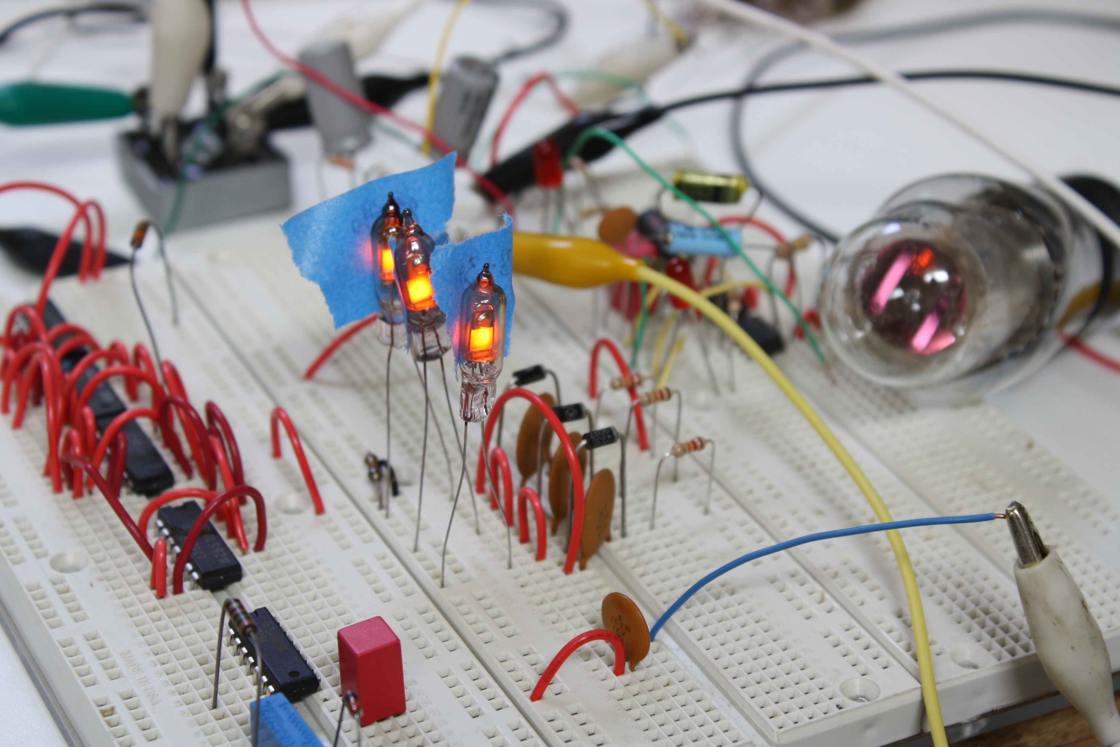 I used a point to point design because it’s enjoyable to try to make something look pretty as well as function. However, when I connected it all up to the dekatron, it didn’t spin. Instead, the glow just rested on one cathode. It may be because the dekatron wasn’t designed to handle small differences in phase shifts but this is only a guess.